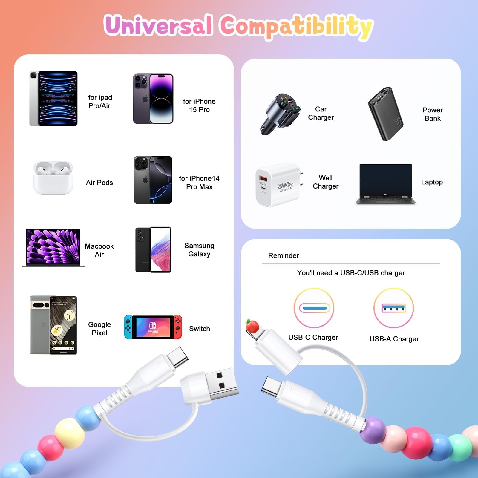 Fargerike perledesign: Lekfull USB C-kabel med sjarmerende fargerike perler med stjerner og hjerter, noe som skaper et stilig tilbehør samtidig som den beskytter kabelen mot floker. Veldig egnet for kvinner og jenter og ideell som gaver.